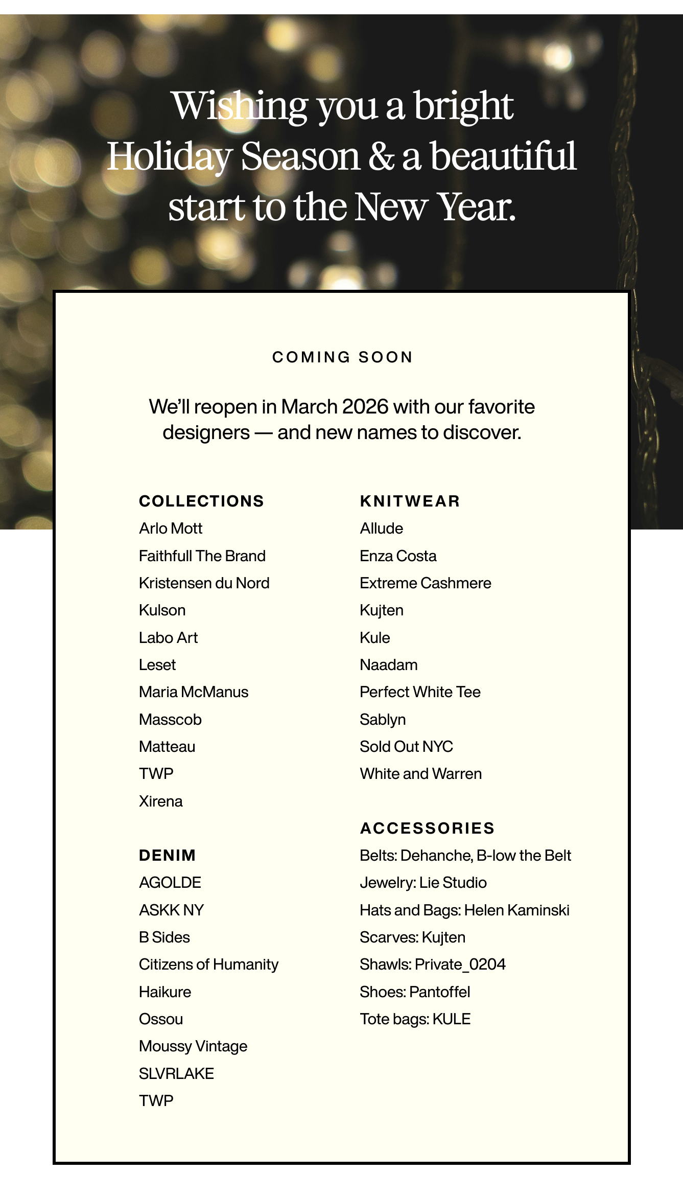 6397 • Allude • Agolde • Arlo Mott • Askk NY • B Sides • B-low the Belt • Botto Giuseppe • Citizens of Humanity • Déhanche • Doffer Boys • Enza Costa • Extreme Cashmere • Faithfull the brand • Goldie. Handvaerk • Hank NY • Haikure • Helen Kaminski • Kallmeyer • Kristensen Du Nord • Kujten • Kule • Kulson • Labo Art • Laurence Bras • Leset • Lie Studio • Mansur Gavriel • Maria McManus • Masscob • Matteau • Moussy Vintage • Naadam • Natalie Martin • Ossou • Pantoffel • Perfect White Tee • Private_0204 • Sablyn • Slvrlake • Sold Out NYC • TWP • White + Warren • Xirena