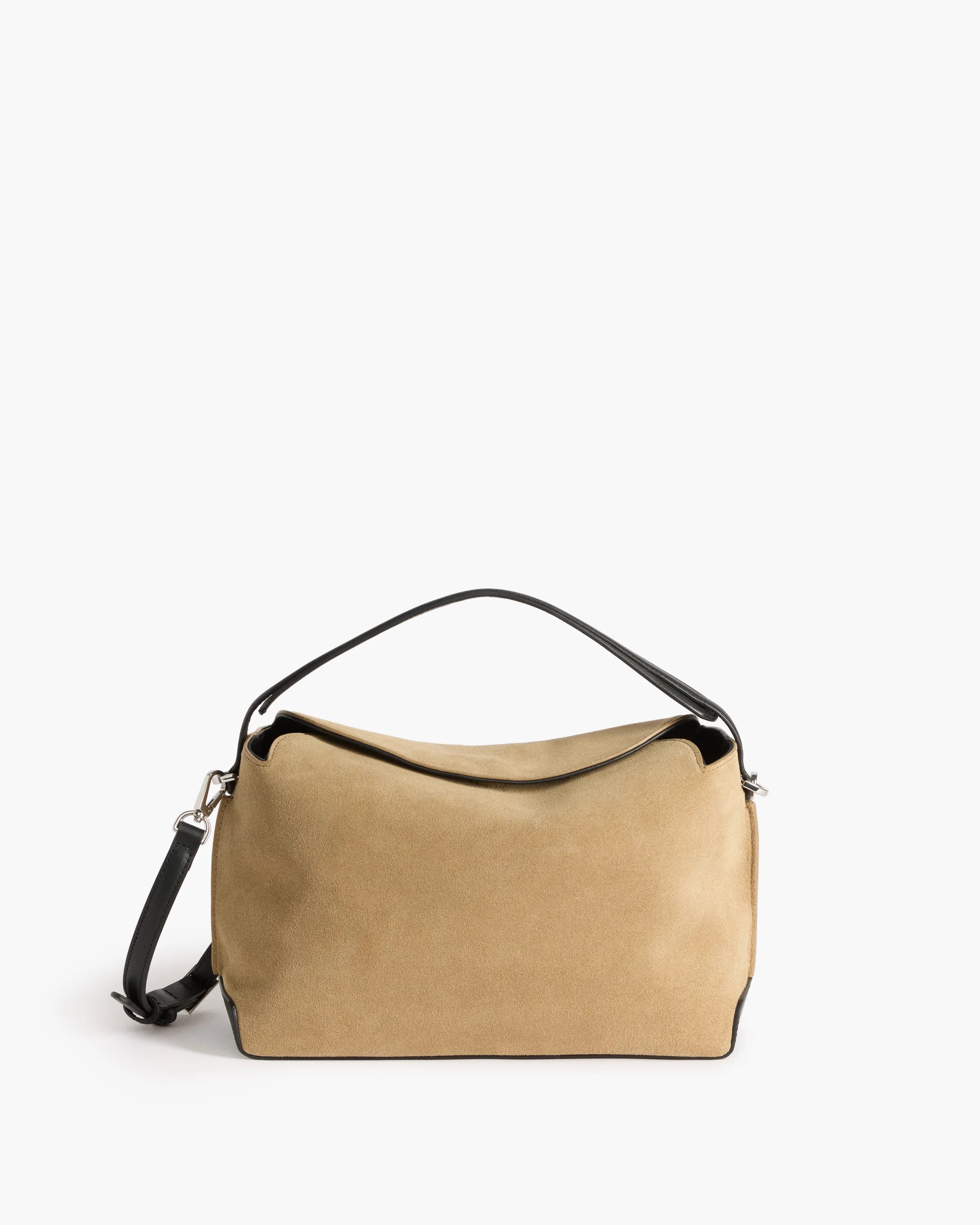 The Helia Handbag in Sand Suede by Flattered. Expertly crafted in Italy, this sophisticated handbag combines premium calf leather with sustainable materials. Designed for versatility, the Helia offers both a structured top handle and an adjustable shoulder strap for multiple carrying options. An interior pocket keeps essentials organized, while the subtle logotype adds understated elegance. Silver-toned hardware complements the soft sand suede beautifully.