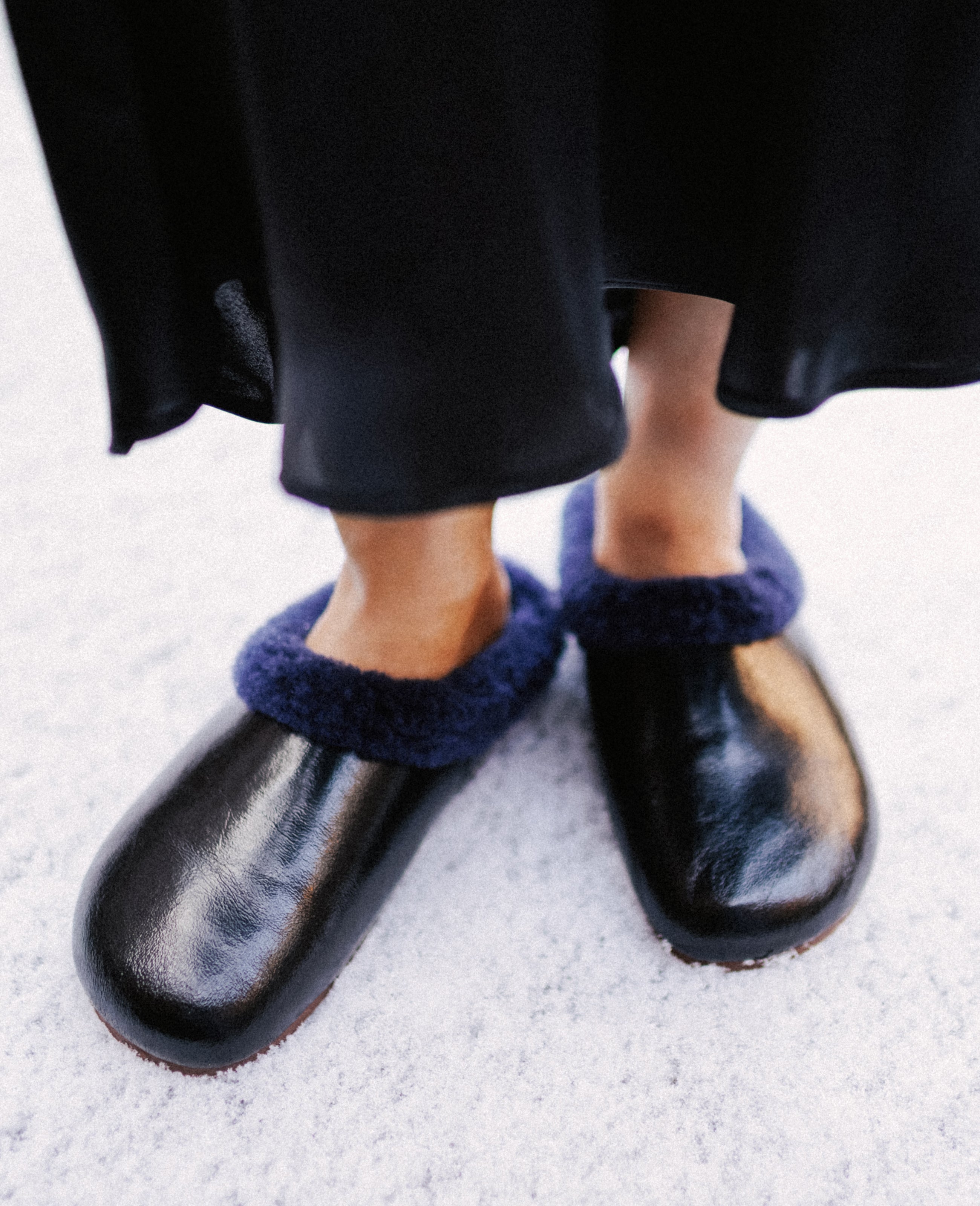 Experience understated luxury with the Pantoffel Muti Slide in Black/Indigo. Featuring a molded cork footbed that adapts to your unique contours and sumptuous African curly shearling lining, these slides deliver personalized comfort with every step. The polished leather upper exudes timeless elegance, while a recycled rubber sole ensures reliable grip and durability. Equally at home indoors or out, the Muti Slide bridges casual comfort and refined style—a sustainable choice for those who value both quality and conscience. Presented in our signature tote.