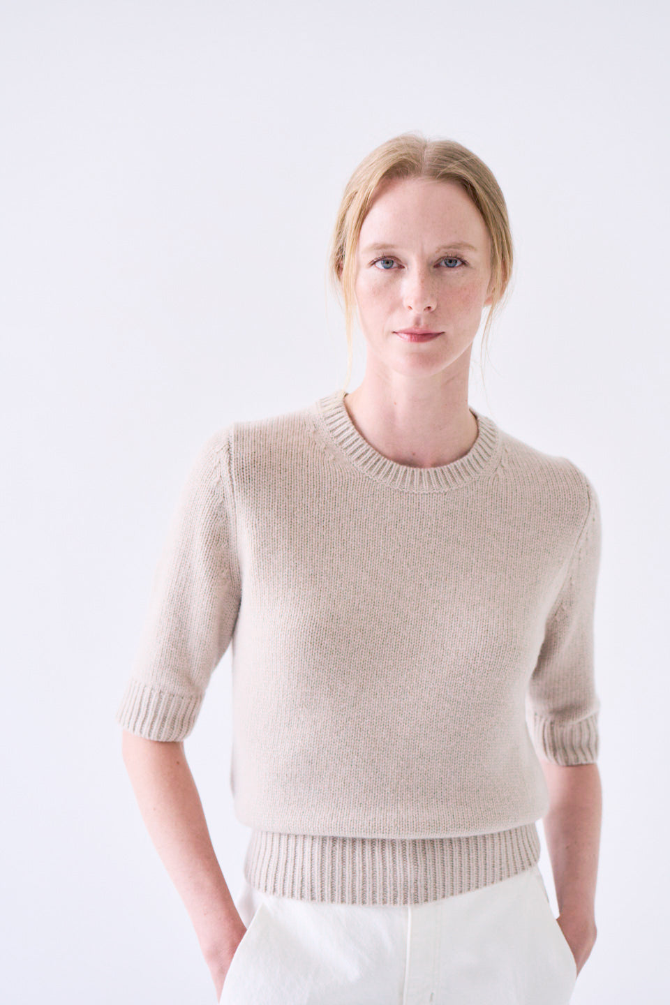 Discover refined elegance with the Margo Crew from Kulson, a lightweight cashmere short sleeve sweater that exemplifies understated luxury. Crafted from premium cashmere, this versatile piece drapes beautifully and offers exceptional softness against the skin. Available in timeless sand and crisp ivory, it seamlessly transitions from casual to polished occasions. A wardrobe essential for those who appreciate quality craftsmanship and enduring style.