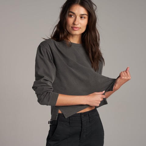 The Reagan Long Sleeve T-Shirt by ROWAN is an oversized, slouchy silhouette with a soft, feminine crew neckline and a slightly cropped length that sits at the mid-waist—easy worn loose or with a relaxed tuck. Crafted from 100% ringspun cotton, it has a durable yet ultra-soft, lived-in feel, enhanced by a garment-dyed heritage wash that develops character over time. Pre-shrunk and made in Los Angeles, it features a 19 3/4" front length (size S). Machine wash cold, tumble dry low. Model is 5'10" wearing size small.