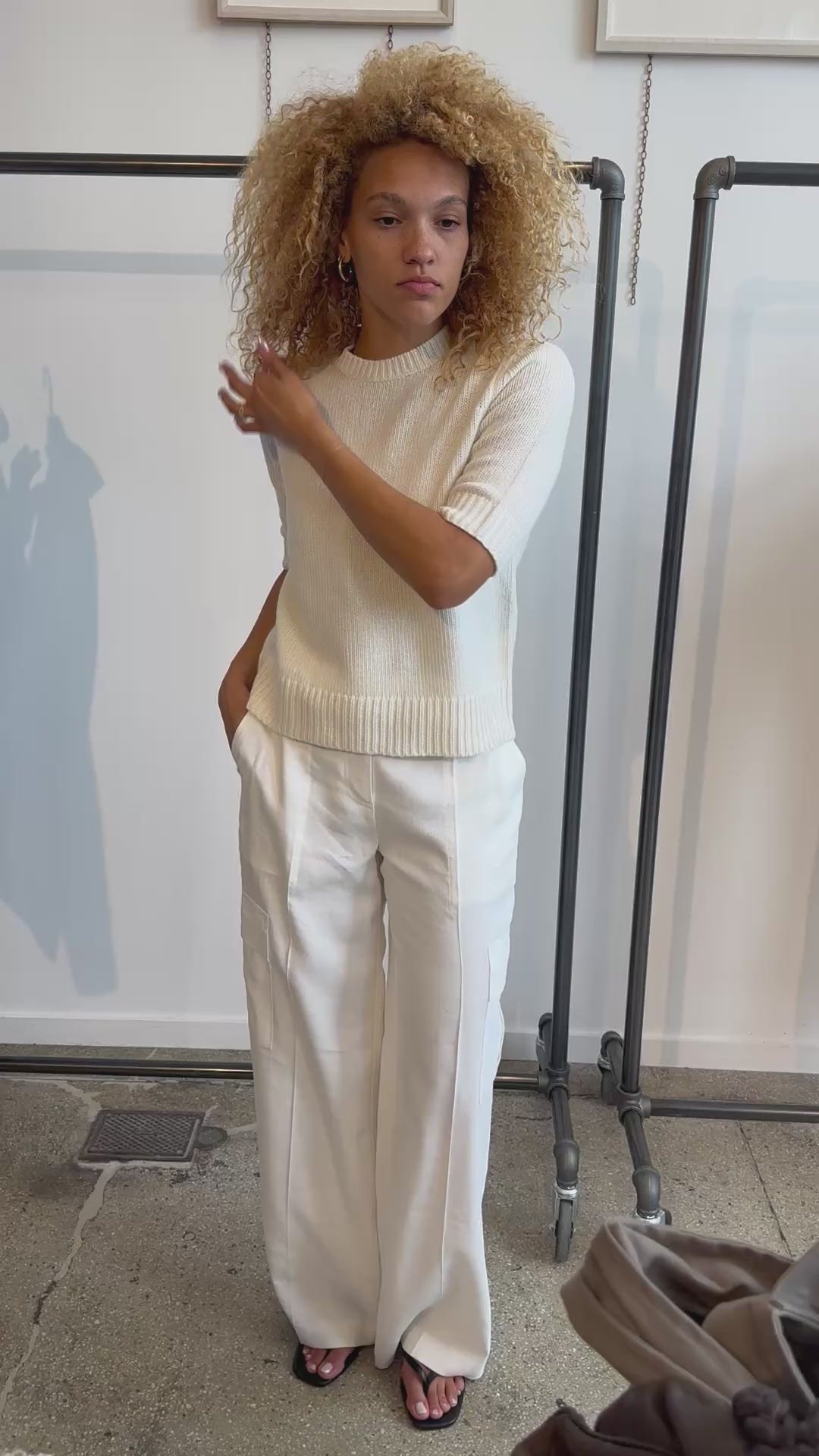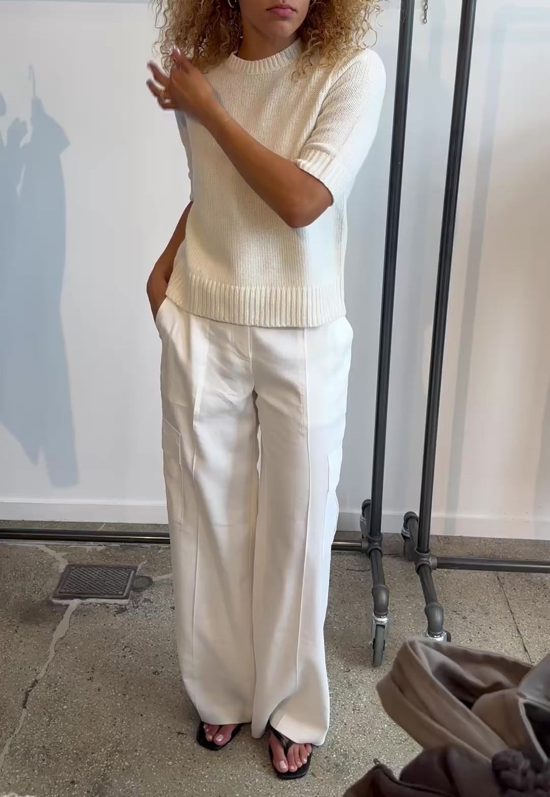 The Margo Crew from Kulson is a premium cashmere short sleeve sweater in ivory. Exceptionally soft and beautifully draping, it transitions seamlessly from casual to refined settings—a timeless essential for discerning wardrobes.